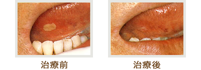 お口の中や、唇にできる口内炎や口角炎の痛みは、レーザーですぐ和らぎ、治りも早くなります。入れ歯があたってできる潰瘍(かいよう)にも効果があります。
